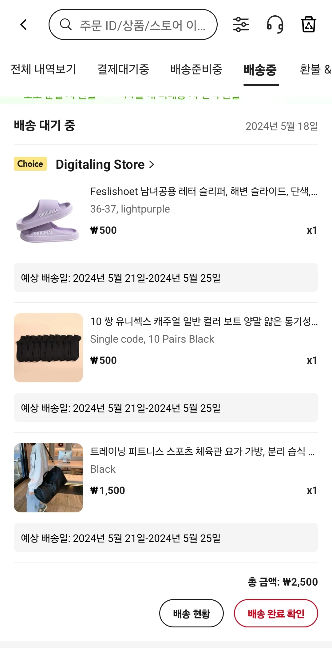 나는 신규유저혜택으로 슬리퍼, 가방, 양말을 주문했다. 양말도 10켤레에 500원, 슬리퍼도 500원에 구매를 했다. 총 3500원을 결제 했지만 중국에서 한국까지 무료로 배송을 해준다고 하니 얼마나 세상이 좋아졌는지 알 수 있는 부분이다.